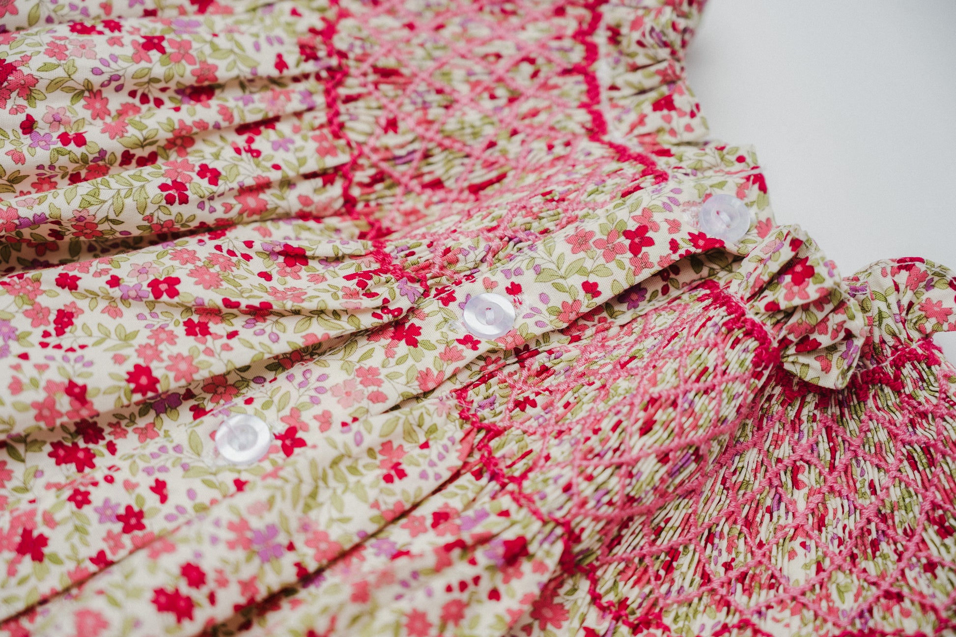 Dieses einzigartige Kleid vereint zeitlose Eleganz mit liebevoller Handarbeit. Das Blumenmuster wird durch feine Stickereien hervorgehoben und macht jedes Stück zu einem echten Unikat.